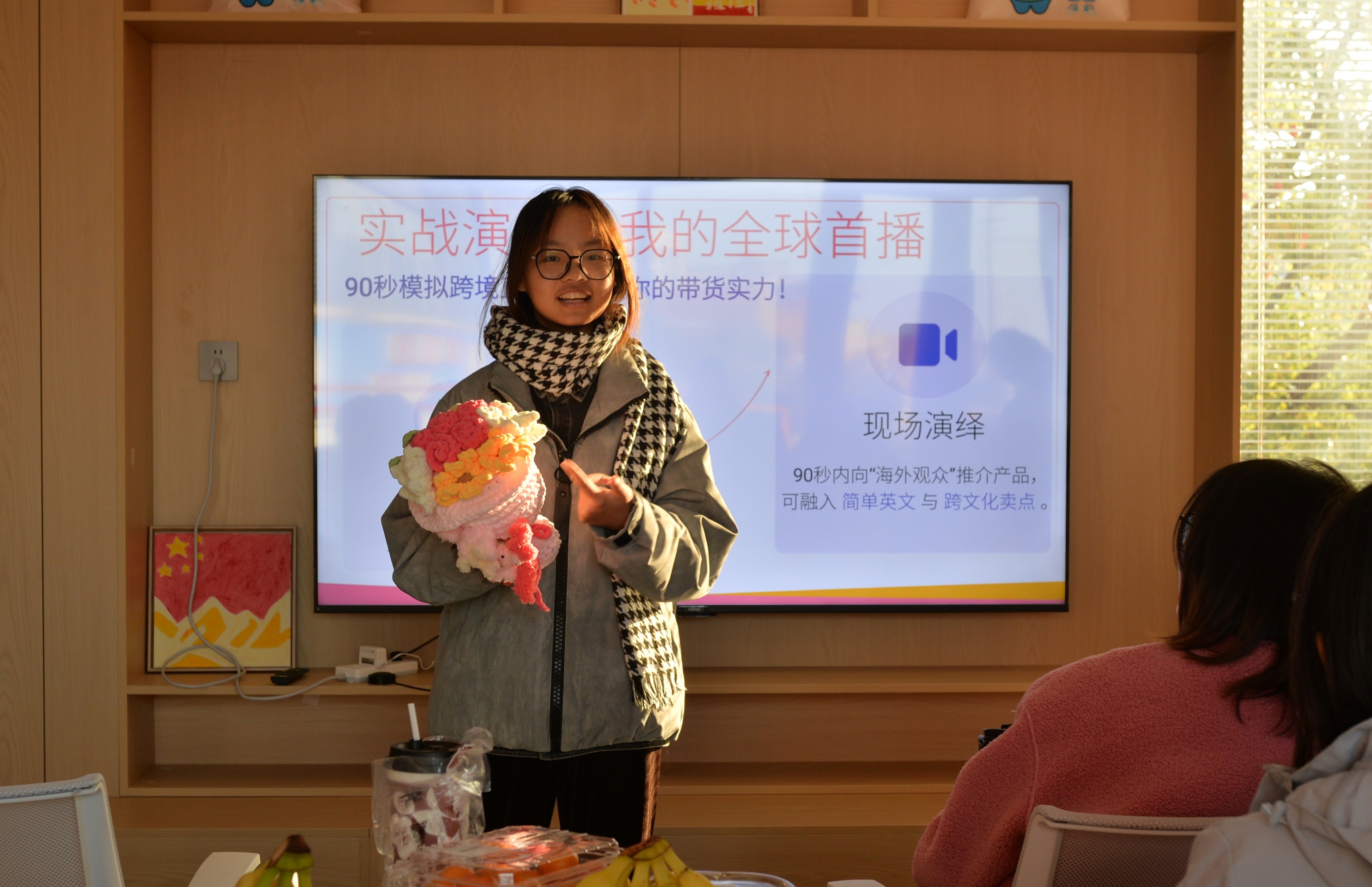 “我的全球首播”实战演练环节将活动推向高潮。主办方提前准备了各种特色单品,参与者轮流上台,在1.5分钟内完成模拟跨境直播推介。同学们充分发挥创意,用幽默的语言向我们介绍产品的优势,精彩的演绎赢得阵阵掌声,充分展现了扎实的专业素养与创新思维。